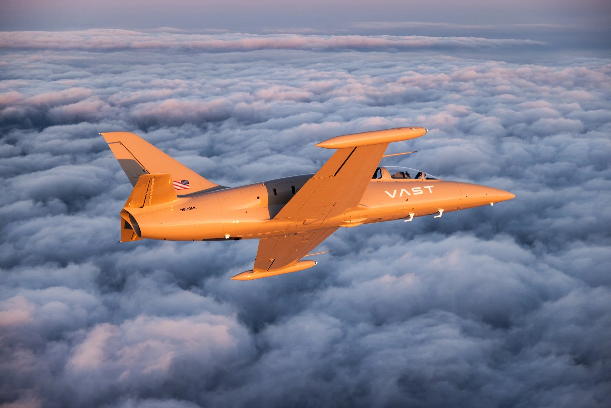 A sleek, orange unmanned aerial vehicle flying above clouds during sunset, with the word VAST on its fuselage and an American flag near the tail. View fullsize
